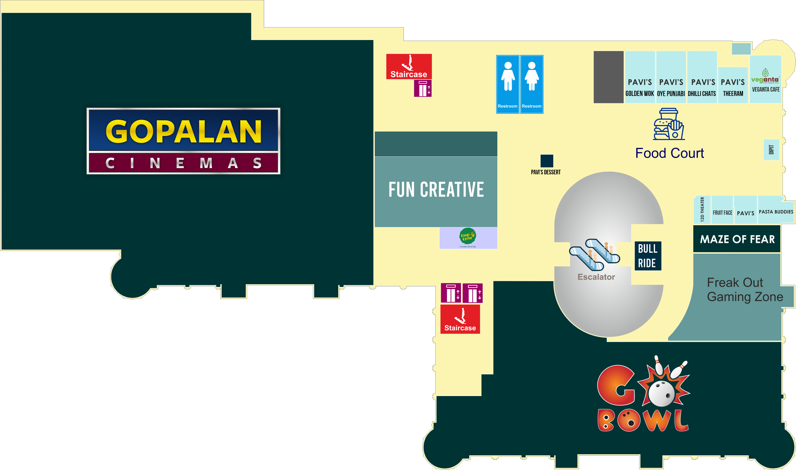 The entertainment facilities include Gopalan Cinemas, featuring three screens with a total seating capacity of 1,017, and an 8-lane bowling alley and Kids zone.